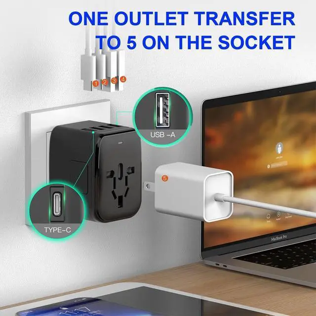 [TYPE C AND SMART USB FAST CHARGER] -The travel power adapter has 3 USB port and 1 Type C interface, 1 AC Socket with smart IC chip which can recognize the different devices, automatically charge 5 devices simultaneously, including :