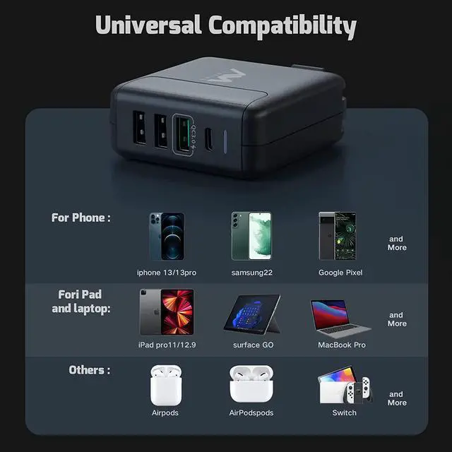 Wide CompatibilityThe usb c charger for multiple devices, such as iPhone 14/14 Pro/14 Pro Max, iPad Pro/Air/Mini, iphone13/13 Pro/13 Pro Max/13 Mini /12/12 Pro/12 Pro Max /12 Mini, MacBook, Galaxy S21/S20/S10, Pixel 3/3XL/4/4XL/5, Switch. And many more USB-A and USB-C electronic devices.