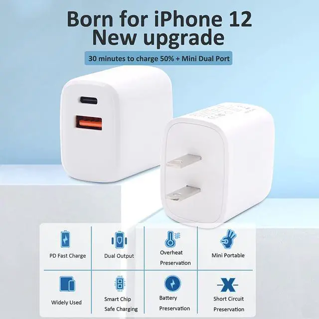 2-Pack 20W fast dual port charger Equipped with USB-C (PD Power Delivery) and USB-A (QC3.0 Quick Charge) dual port with totally 20W output, you can charge two devices at the same time