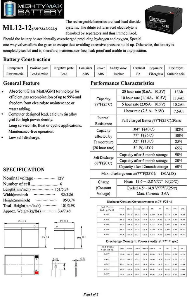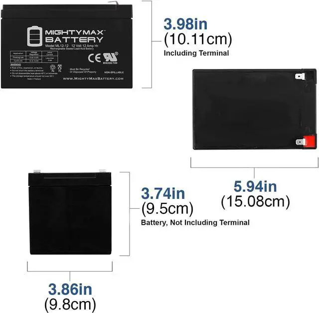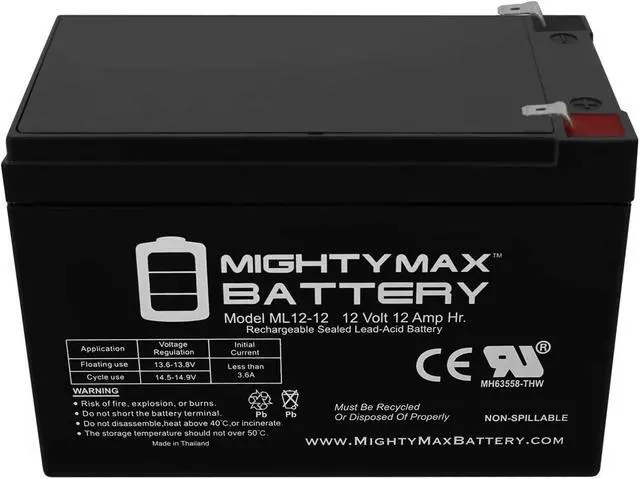 Delivering power when you need it, the Mighty Max ML12-12F2 12 Volt 12 AH uses a state of the art, heavy-duty, calcium-alloy grid that provides exceptional performance and service life in both float and cyclic applications.The ML12-12F2 is an Absorbent Glass Mat (AGM) technology with a valve regulated design, that can be used in enclosed and indoor environments without leaking or maintenance, providing a superior performance for thousands of models.Mighty Max SLA batteries are utilized in a wide variety of applications including; Consumer Electronics, Electric Vehicles, Engine Starters, Golf Carts, Hunting, Lawn and Garden Tools, Medical Mobility, Motorcycles, Power sports, Portable Tools, Solar, Toys and Hobby, Access Control Devices, Emergency Lighting, Security and more.Specifications
