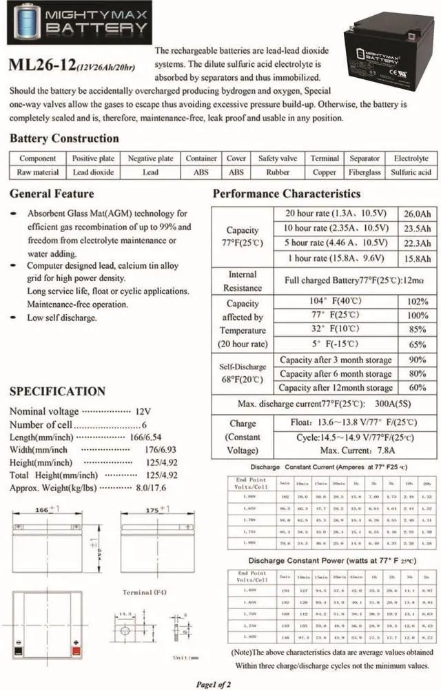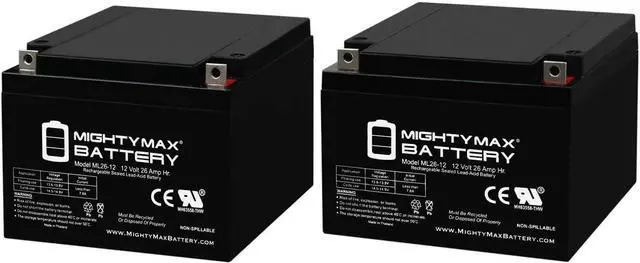 • ML26-12 SLA is a 12V 26AH Sealed Lead Acid (SLA) rechargeable maintenance free battery, Pack of 2 - UL Certified