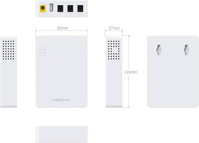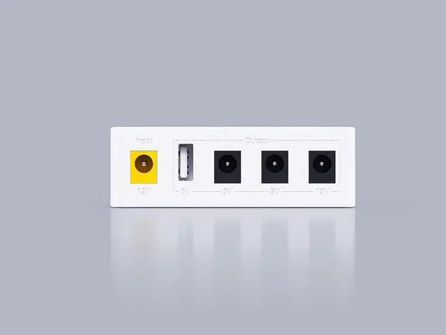 Input: DC12V/2.0A;Output:include DC 12V/1.5A, 9V/2.0A, 5V/2.0A (1 port each) and USB 5V/2.0A (1 port), max total output 18W;Design: Compact (4.53"L x 3.27"W x 1.06"H), lightweight (Total GW 1.08 lbs) with wall-mount slots for easy placement;Battery: 10000mAh/3.6V (36Wh) high-quality lithium-ion battery for extended backup