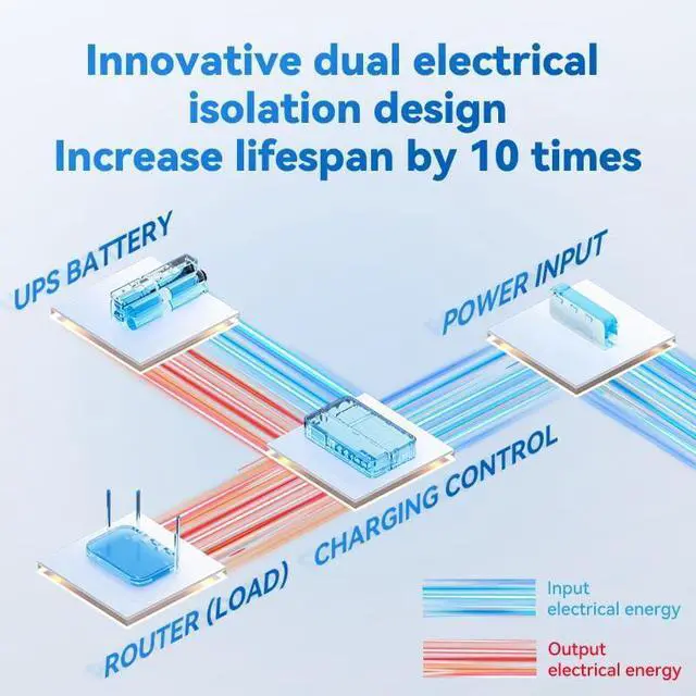 When you receive the product, the UPS battery is low. Please charge it for more than 6 hours. It is best to fully charge the UPS separately before use. The fully charged UPS state is that all four blue indicator lights are on.Please use our matching adapter or your device's adapter to reach 2A or higher.Please check your device voltage and current before purchasing.The device will automatically shut down after 8 minutes without any connection or operation.
