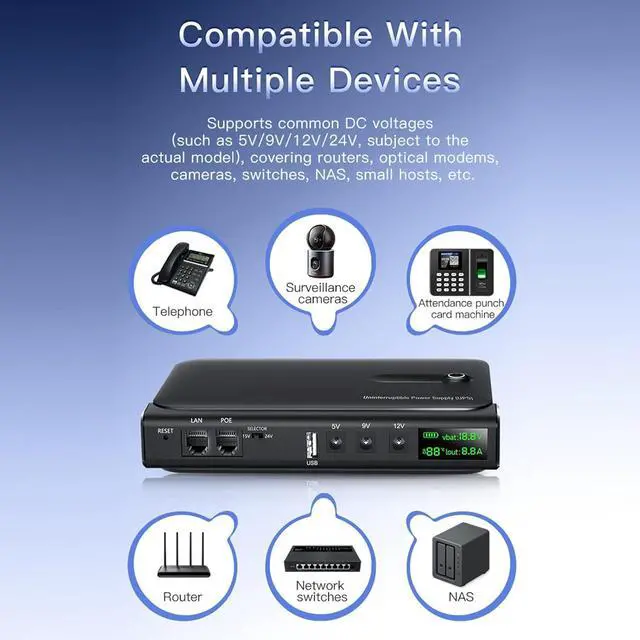 [Versatile Compatibility] Designed with multiple output options including 5v 9v 12v dc usb lan and poe ports this power backup unit supports a wide range of equipment. from routers and security cameras to small electronics and network devices it delivers reliable power solutions for various applications.