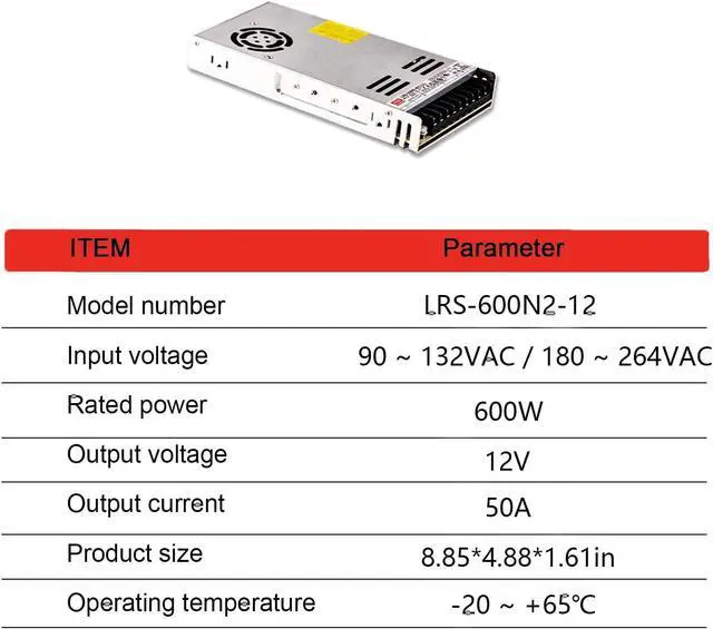 Key Specifications: This unit provides a 12V output at 50A, housed in a compact 8.89" x 4.88" x 1.61" metal enclosure. A built-in DC fan with speed control ensures optimal thermal management, making it suitable for space-constrained applications.
