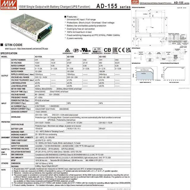 5-in-1 Safety Protection UL TUV certified AD-155A features short circuit/overvoltage protection (15.87-18.63V).
