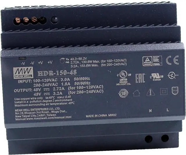 Easy DIN Rail Mounting & LED Indicator: Designed for quick installation on TS-35/7.5 or TS-35/15 DIN rails, the HDR-150-48 simplifies system integration. The LED indicator provides clear power status confirmation.