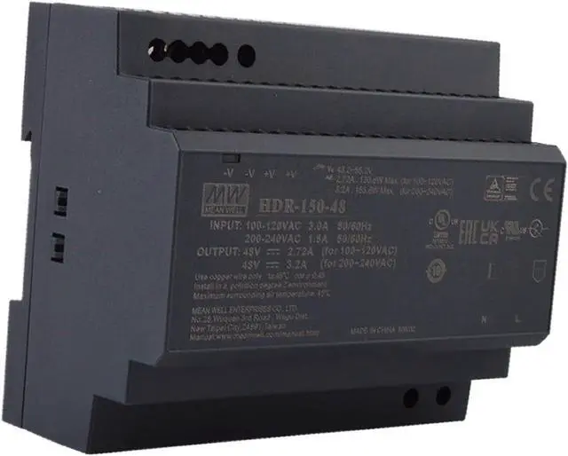 Compact & Powerful: The TorqCali HDR-150-48 delivers 150W (153.6W @ 230VAC) of power at a constant 48V within an ultra-slim 105mm (6SU) width, perfect for space-saving DIN rail installations in industrial control systems and telecommunications infrastructure.