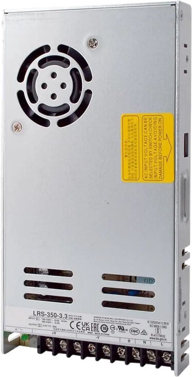 User-Friendly Features: The LRS-350-3.3 includes an integrated DC fan with on/off control, a power-on LED indicator, and low no-load power consumption (<0.75W) for added convenience and energy savings.