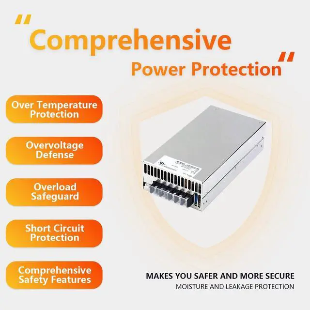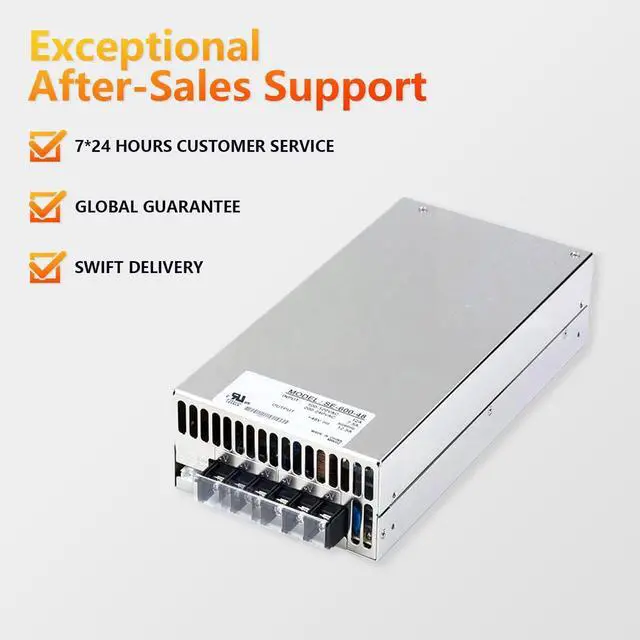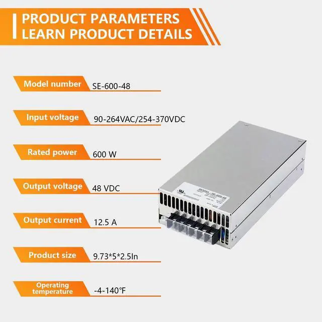 The SBJ SE-600-48 is a premium AC-DC switching power supply engineered for high-performance applications, delivering reliable and efficient power conversion. This unit excels in industrial, telecommunications, and LED lighting scenarios, offering exceptional durability and versatility. Key specifications include a 600W output power with a stable 48V DC voltage and a rated current of 12.5A, adjustable from 0 to 12.5A. The input voltage range spans 90-264VAC or 254-370VDC, accommodating various power sources worldwide. Efficiency stands at 88%, promoting energy savings and reduced operational expenses. Protection mechanisms cover short-circuit, overload, over-voltage, and over-temperature scenarios, enhancing safety during continuous use. Additional features include remote sensing capability for precise voltage control, a built-in DC fan for effective cooling, and a high power density of 4.9W/in³ for compact installations. Physical dimensions are 9.73 inches in length, 5 inches in width, and 2.5 inches in height, with a weight of 4.62 pounds, making it portable yet robust. Operating temperatures range from -4 to 140°F, ensuring performance in diverse climates. Safety certifications encompass UL, EAC, CB, BIS, BSMI, CE, EMC, KC, and UK, meeting global standards for quality assurance. Applications extend to industrial automation, communication systems, and LED lighting projects, where its cost-effective design and reliable output shine. In summary, the SBJ SE-600-48 provides a dependable, efficient, and certified solution backed by a 2-year coverage period, ideal for enhancing power stability in professional settings.