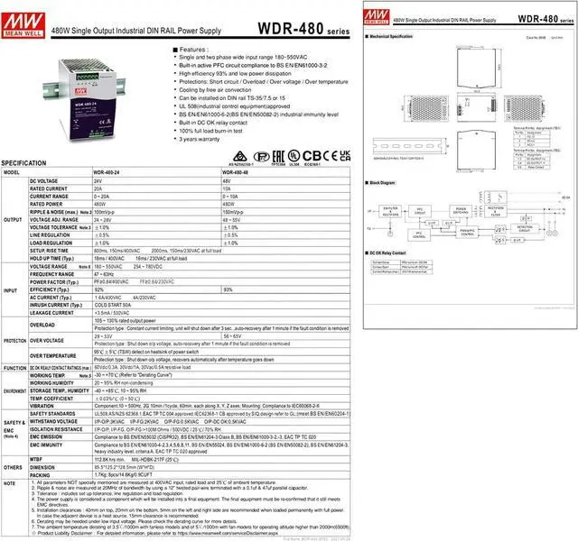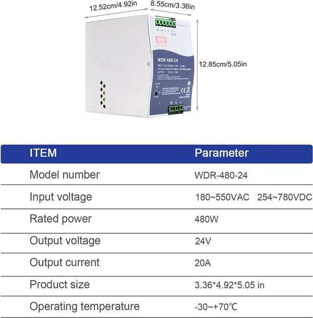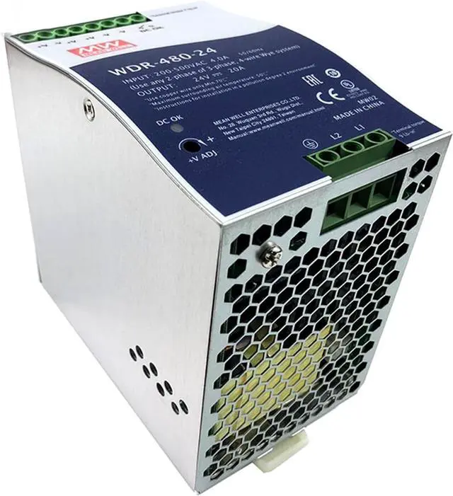 WDR-480-24 is a high-performance 480W single-output DIN rail industrial power supply designed to meet the demanding needs of various industrial applications. This unit delivers a stable 24V DC output with a current rating of 20A, making it suitable for a wide range of devices and systems. Key Features: Wide Input Voltage Range: The WDR-480-24 accepts a wide input voltage range of 180-550VAC or 254-780VDC, making it suitable for use in regions with fluctuating voltage. High Efficiency: With an efficiency rating of 93%, this power supply minimizes energy loss, reducing heat generation and operating costs. Active Power Factor Correction: The built-in active PFC circuit ensures compliance with BS EN/EN61000-3-2 standards, minimizing harmonic distortion and improving power quality. Comprehensive Protection: The WDR-480-24 incorporates multiple protection mechanisms, including short circuit, overload, overvoltage, and overtemperature protection, ensuring the safety of the power supply and connected equipment. DIN Rail Mounting: Designed for convenient installation on standard TS-35/7.5 or TS-35/15 DIN rails, allowing for easy integration into existing systems. Natural Air Cooling: The power supply utilizes natural air cooling, eliminating the need for a fan and reducing noise levels. Built-in DC OK Relay Contact: Provides a convenient signal for monitoring the power supply's output status. 100% Full Load Burn-in Test: Each unit undergoes a rigorous 100% full load burn-in test to ensure reliability and performance. UL508 and EN61000-6-2 Certified: Compliant with UL508 (Industrial Control Equipment) and EN61000-6-2 (EN50082-2) industrial immunity standards, ensuring reliable operation in demanding environments. Applications: WDR-480-24 is an ideal choice for a wide range of applications, including: Industrial control systems Semiconductor manufacturing equipment Factory automation Machine and electrical equipment Other Features: Output voltage accuracy: ±1% Ripple and noise: 100mVp-p Operating temperature: -30°C to +70°C Weight: 3.75 lbs WDR-480-24 is a reliable, efficient, and feature-rich DIN rail power supply designed to meet the needs of demanding industrial applications. Its wide input voltage range, high efficiency, comprehensive protection features, and compact design make it an excellent choice for a variety of industrial automation, control, and power distribution needs.