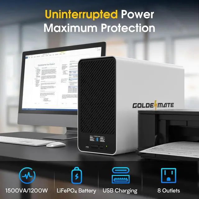 1AVR & Pure Sine Wave2Line-Interactive UPS GOLDENMATE New Released Large Capacity UPS 24/7 Power Supply for All Your Needs Comprehensive Protection for Your Devices GOLDENMATE UPS: Power Outage Solutions