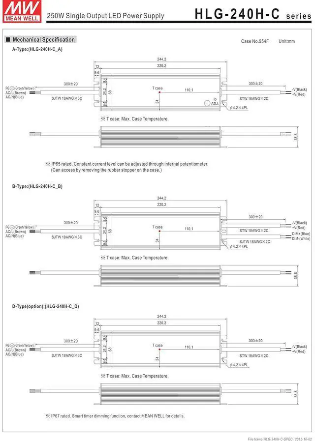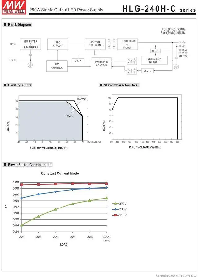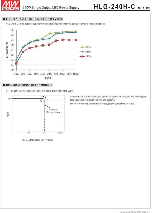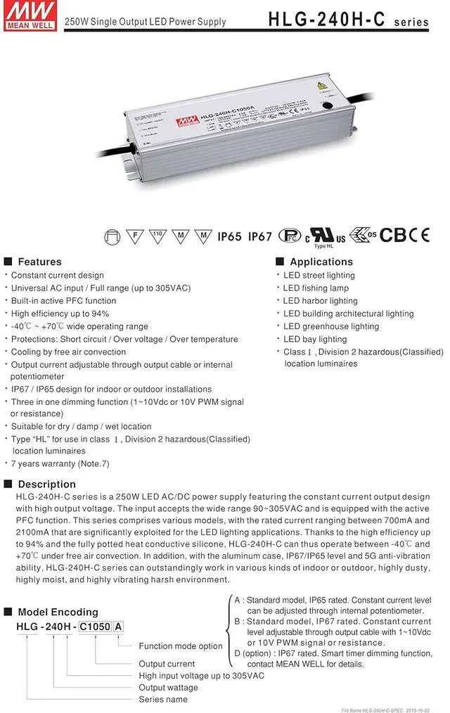 Built-in active PFC function High efficiency up to 94% IP67 / IP65 design for indoor or outdoor installations Suitable for LED lighting and street lighting applications Universal AC input (up to 305VAC) / Full range