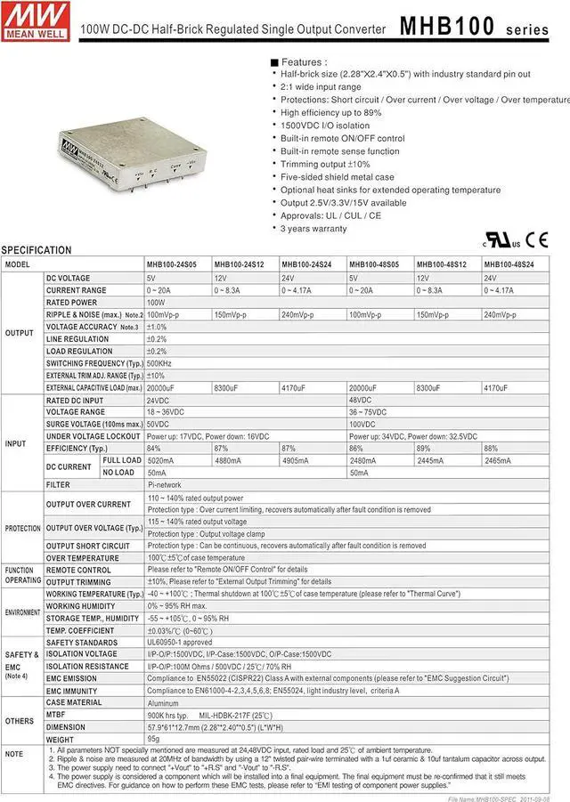 Half-brick size (2.28"x 2.4"x 0.5") with industry standard pin out Dual in line package 2:1 wide input range Protections: Short circuit / Over current / Over voltage / Over temperature 3 years warranty