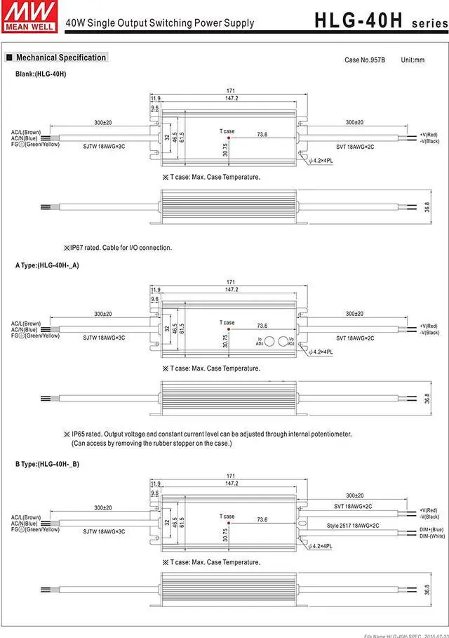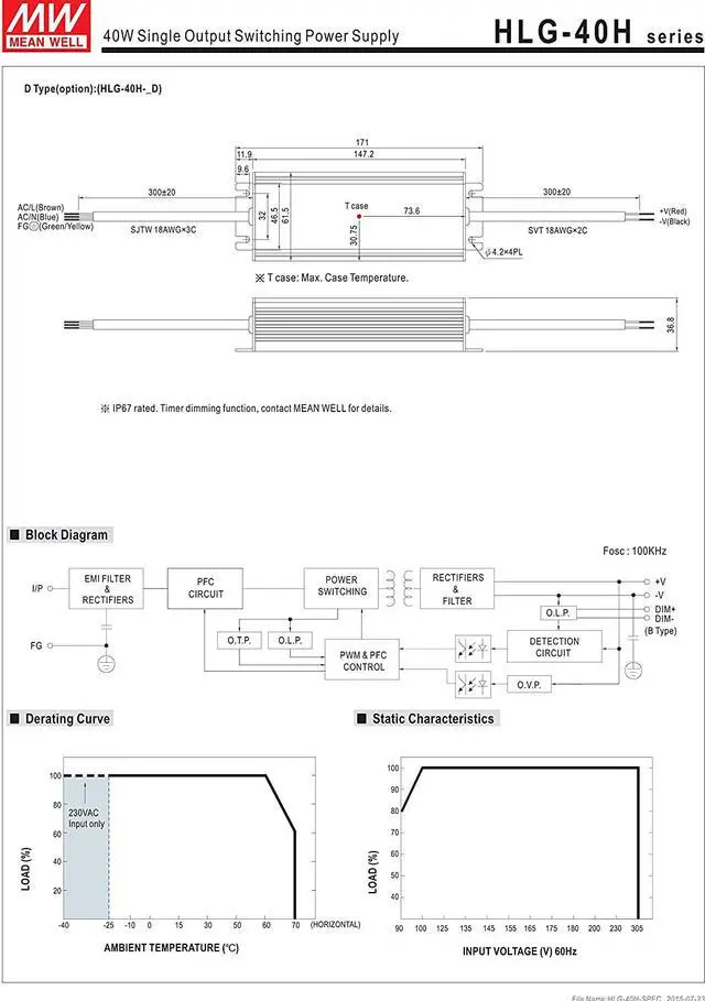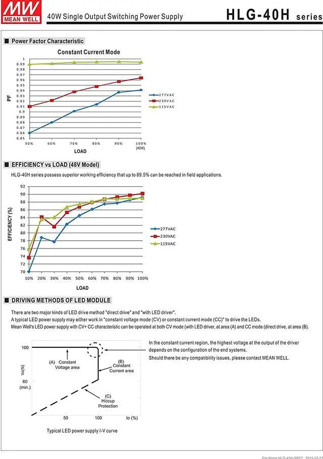 Universal AC input (up to 305VAC) / Full range Suitable for dry, damp, and wet location Suitable for LED lighting and street lighting applications Optional CCC models available (HLG-40H/60H-A/B/Blank-Type) 7 years warranty