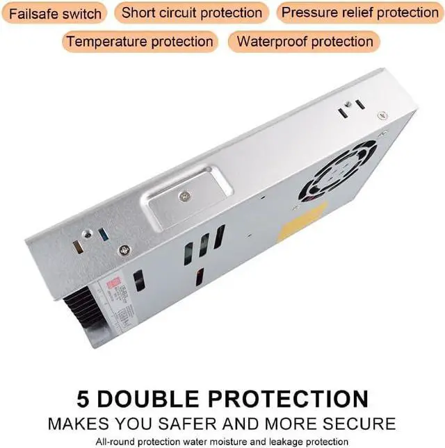 The LRS-450 series by features robust 450W power supplies that deliver high performance and reliability. Designed with metal enclosures for excellent heat dissipation and equipped with internal DC fans, these units ensure effective cooling and continual operation at temperatures up to 70°C. Each model can withstand 5G vibration and operate up to 5000 meters altitude, making them perfect for challenging industrial environments. With multiple certifications including UL and TUV, and protections against short circuit, overloading, and over-temperature, the LRS-450 is suitable for various applications such as industrial automation, control systems, and electrical devices.