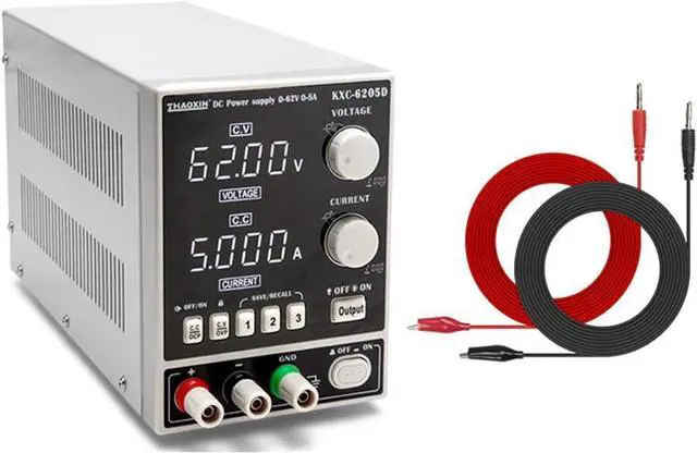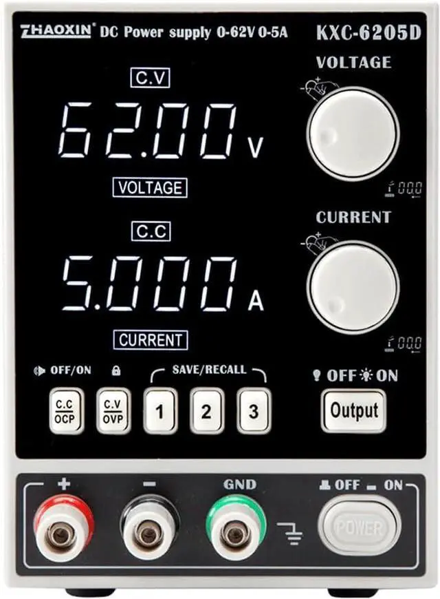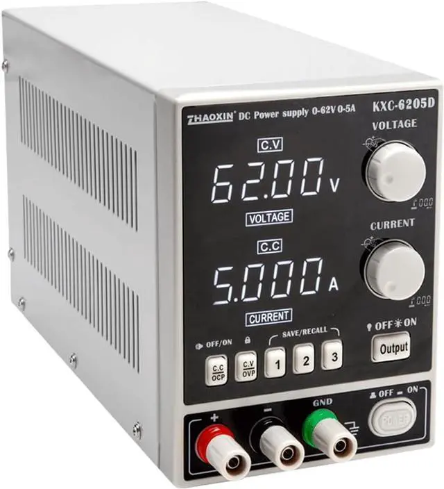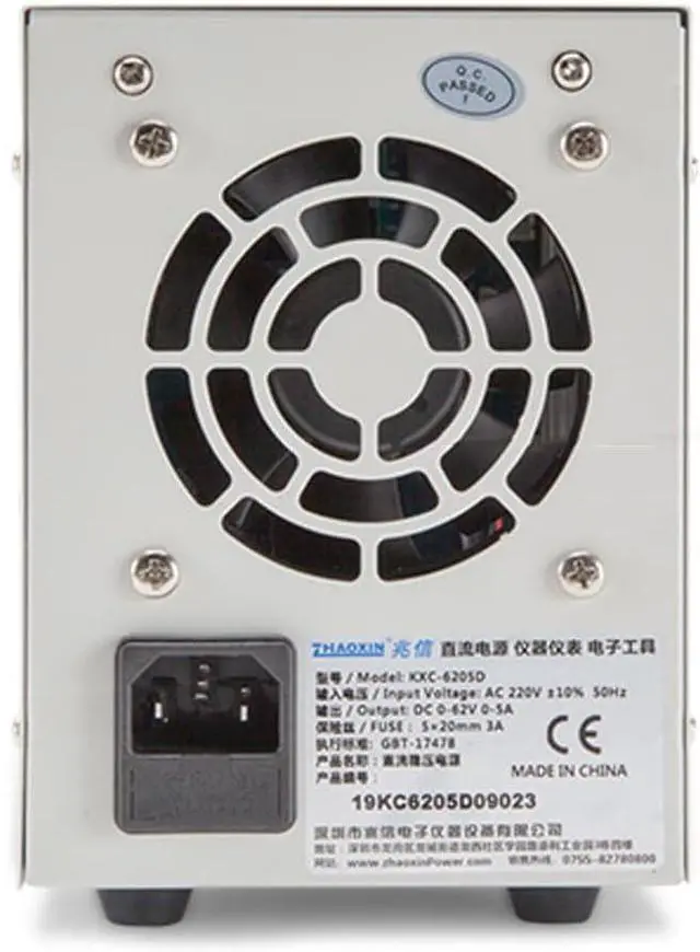ModelKXC-6205D Input voltageAC 220V±10% 50Hz Operating temperature -1040relative humidity<80% Storage temperature -1040relative humidity<90% Rated power310W Output voltage0-62V Output current0-5A Output voltage/current preset Over voltage protection Closure protection Output start/stop Power display Storage function Load Regulation Voltage 0.05% Current 0.1% Power regulation rateVoltage 0.01% Current 0.01% Set value resolution Voltage 10mV Current 1mA Set value accuracy Voltage ±0.2% Current ±0.2% Set value resolution Voltage 10mV Current 1mA Read value accuracy Voltage ±0.2% Current ±0.2% Read value accuracy 0.15% Vp-p Temperature coefficientVoltage 0.15% Current 0.2% Read value temperature coefficient Voltage 0.1% Current 0.1% Display method4 digit LED digital tube White ResolutionVoltage 0.01V Current 0.001A Dimensions278×112×156mm Weight2.04Kg