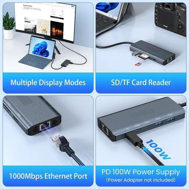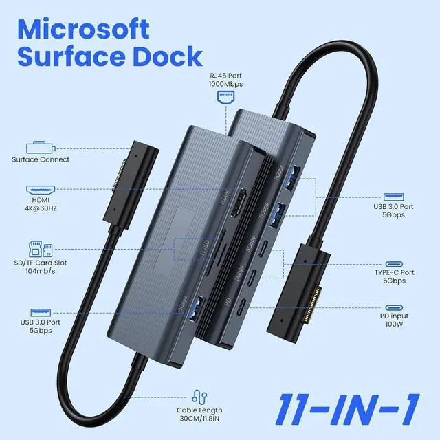 11-IN-1 MS Surface Docking StationThe 11-in-1 surface dock with simple plug and play connectivity, built to boost your productivity. The MS Surface Travel Hub uses popular surface connection technology, giving you an incredible range of functions. 11-in-1 MS Surface Pro dock equips with 4K@60HZ HDMI ports, 1000Mbps Gigabit RJ45 port, 2x USB C Data port, 3x USB 3.0 Ports, SD/TF Micro SD card, 100W PD Power input.