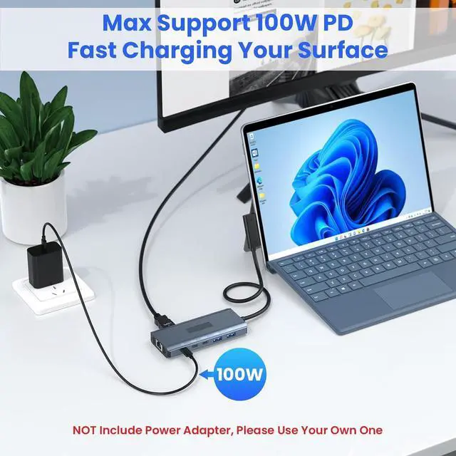 MS Surface Dock Hub with 100W PD Input Supply The latest surface accessories support 15V/4.8A power supply, say goodbye to the original 45W charger, enjoy faster charging speed and improve your office efficiency. Take your laptop battery from low to full within 3hours, also with extra power for your phone and accessories(Note: Please connect the power supply adapter(Not Included) to our surface laptop docking station when using).