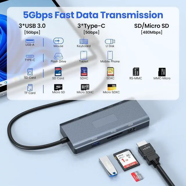 Ultra-High Speed Data TransferMS Surface Pro Docking Station multiport adapter offers 2x USB C and 3x USB 3.0 ports for fast transmission up to 5Gbps. It takes only a few seconds to transfer photos or videos to your laptop. High-Speed Docking Station with also with TF/SD Card Reader data transfer up to 480Mbps. Surface dock station perfect for connecting the USB peripherals such as flash drive, hard drive, keyboard, mouse, printer and more.