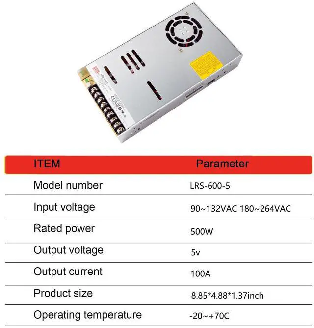 Reliable Performance: 90-132VAC/180-264VAC (selectable) and 255-370VDC input voltage range. 5V output voltage with 100A rated current, delivering 600W of power. Built-in DC fan for forced air cooling with on/off control. MTBF > 1KK hrs.