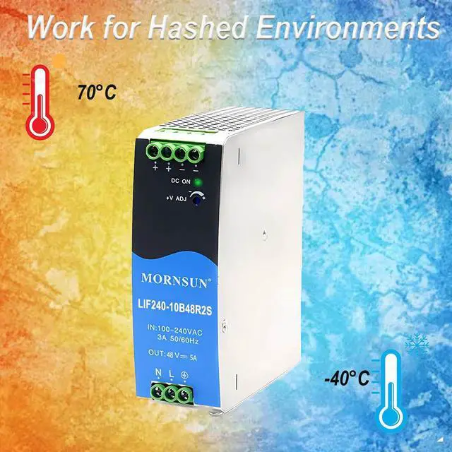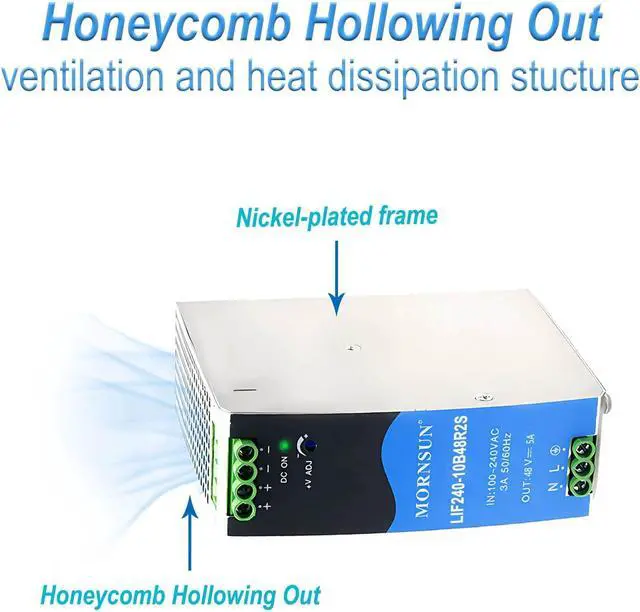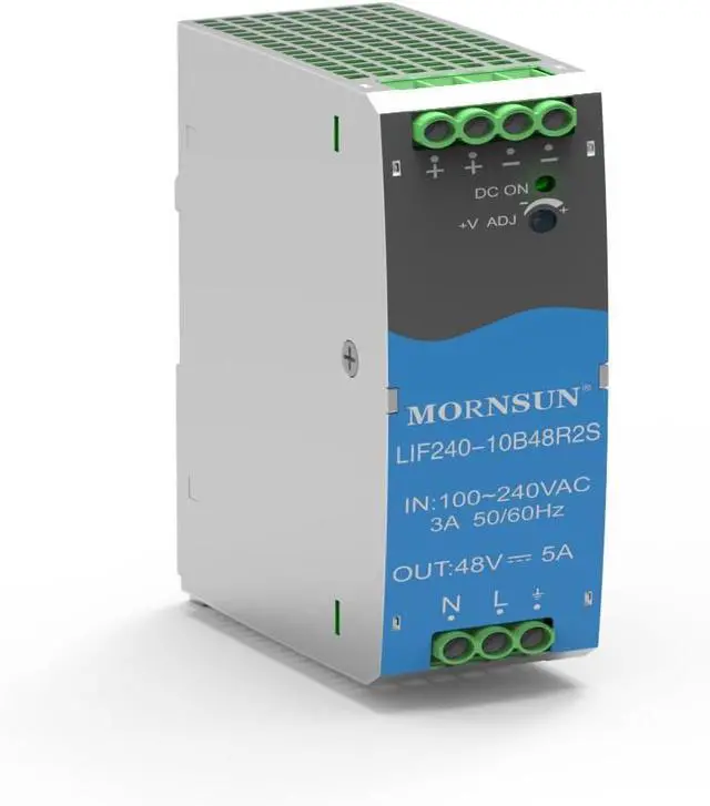 Anti-interference capabilityThis 240W DIN rail power supply features a universal terminal for both AC and DC input, with bottom AC input and top DC output to enhance stability.