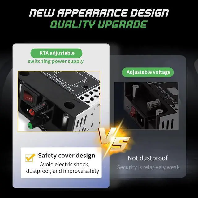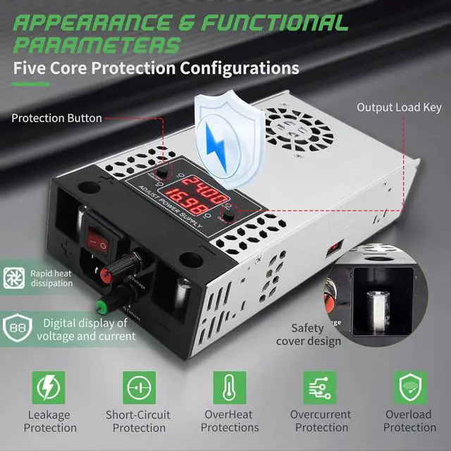 Intelligent cooling system: The adjustable 0-30V 0-16A 500W power supply equipped with multiple cooling holes, built-in fan and dustproof mesh, effectively prevent dust intrusion, ensure stable fan rotation and prevent circuit board burning.