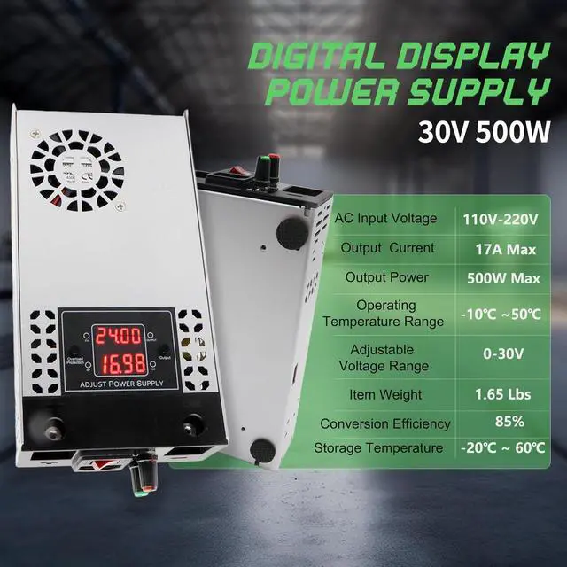 Upgrade Adjustable 0-30V power supply:Input voltage AC 110V/230V,output voltage DC 0-30V, rated power 0-16Amp 500W. This is the latest model of adjustable and displayable DC power supply, which can display both voltage and current.