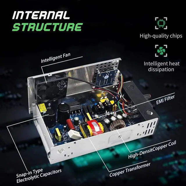 Durable with efficient:Power supply Attractive design, easy to operate and can work for a long time under full load.Power supply adopts a frosted aluminum alloy housing, Equipped with built-in fan,Intelligent chip, Multiple wiring methods, All copper nickel-plated terminal material, which has good electrical conductivity and high conversion efficiency, Can be hung on the wall.