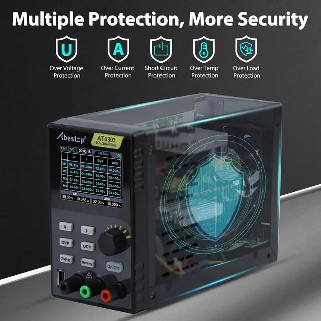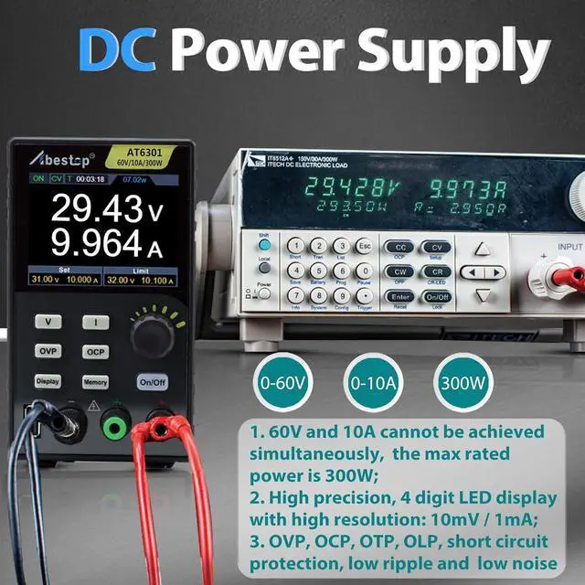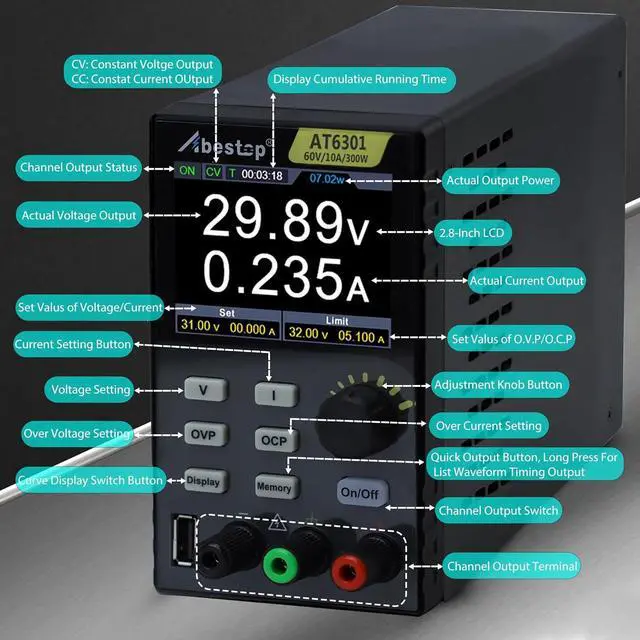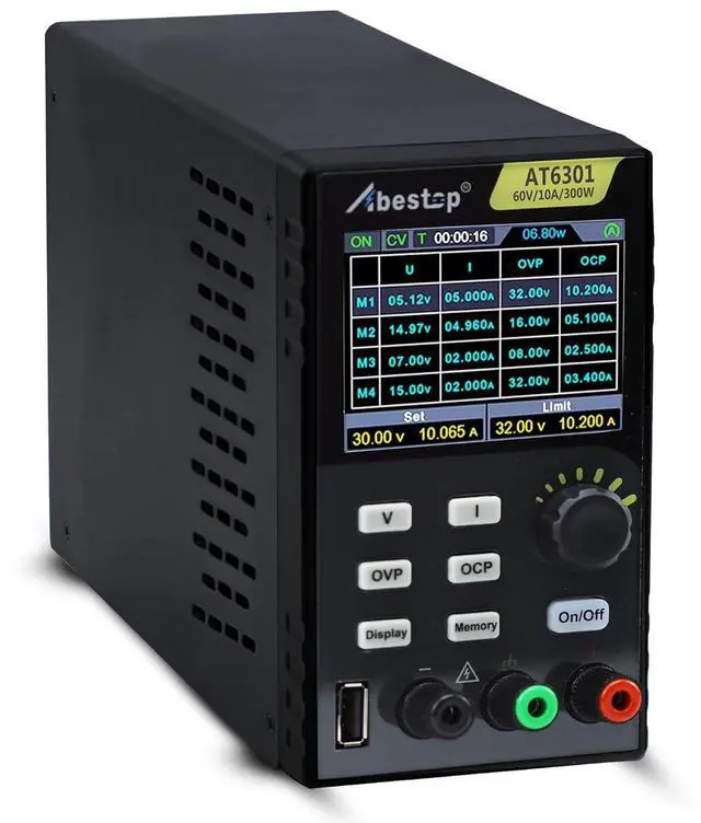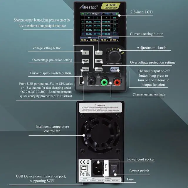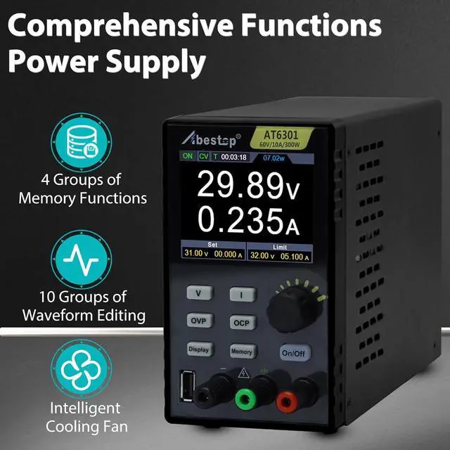 Parameter(AT6301)Output Ranges: 0~60V/0~10A, Output Power: 300W, 60V and 10A cannot be achieved at the same time; USB Port: 9V/1.5A or 5V/2A; 50-60Hz; High resolution: 10mV /1mA; Working Temperature: 0-40; Storage 4 groups of data; 2.8-inch IPS LCD display. USB communication interface, support SCPI