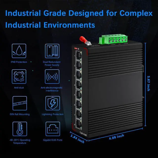 Industrial Grade DesignThis industrial network switch is IP40 protection grade, -40~185°F operating temperature. Anti-lightning, anti-static, anti-electromagnetic interference, surge protection, work well in various harsh environments.