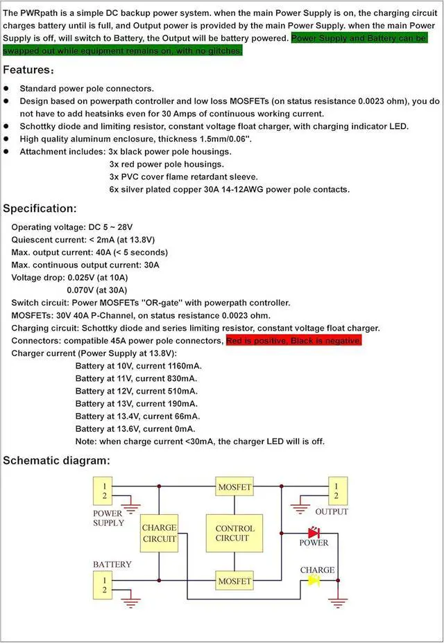 Operating voltage: DC 5 ~ 28V, Quiescent current: < 2mA (at 13.8V), Max. continuous output current: 30A, Switch circuit: Power MOSFETs "OR-gate" with powerpath controller.