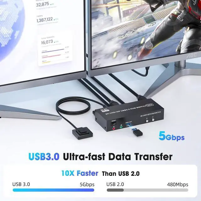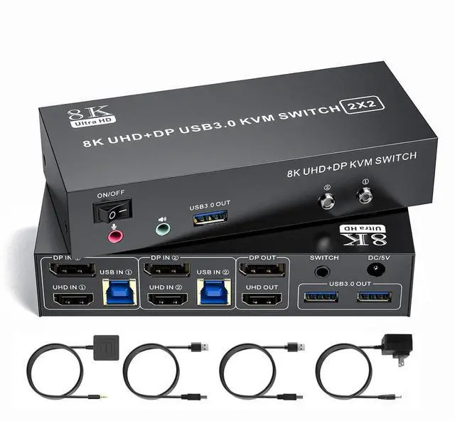 8K Resolution & HDCP:Enjoy crystal-clear visuals with support for resolutions up to 8K@60Hz, 4K@120Hz,2K, 3D, and 1080P, giving you the flexibility to meet various display needs. The DP HDMI KVM switch also supports HDMI 2.1, HDCP 2.3/2.2/1.4, USB3.0,USB 2.0, 3D, and HDR, ensuring stunning, lifelike image quality with vibrant colors that truly pop.