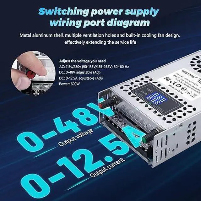Upgraded LED DisplayThis 48v dc power supply is made with high-quality magnetic flux materials and multiple ventilation holes. It features a built-in cooling fan, ensuring efficient heat dissipation. 48v power supply made of shiny aluminum casing with an LED digital display and status indicator lights, providing clear and visible power supply operation status.