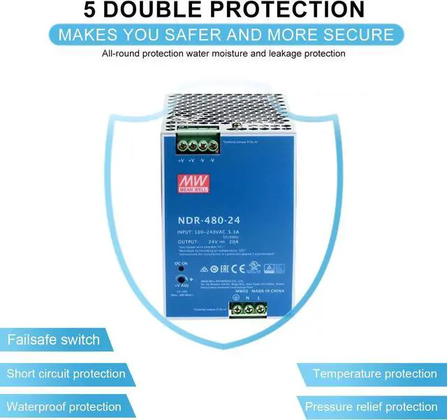 Built-in Safety: Compliant with UL508 and BS EN/EN61000-6-2 industrial standards, the NDR-480-24 features short circuit, overload, over voltage, and over temperature protections for enhanced safety.