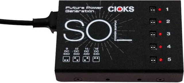 Ultra-low noise achieved by multistage filtering 5 isolated DC-outlets, 6W each Total maximum power 30W Mounting hardware for Pedaltrain and Templeaudio Boards included 9 Flex cables included