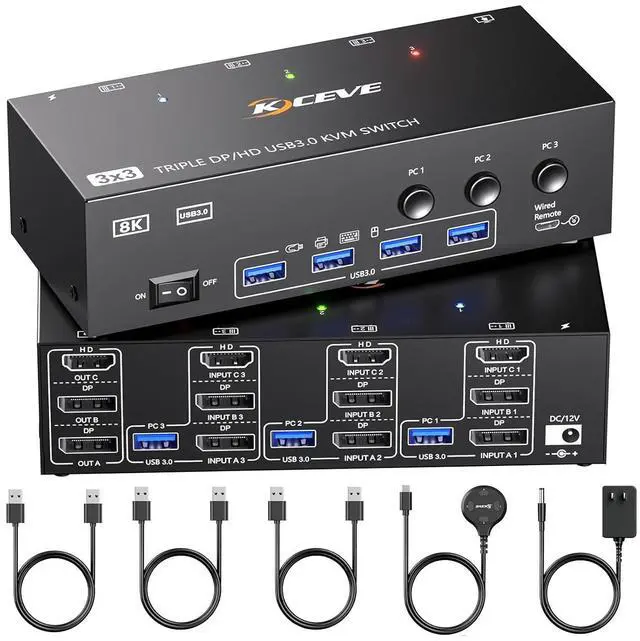 Great compatibility & 2 switching modesKVM switch 3 monitors driver-free for Windows, Mac, Linux, Unix. Support Laptops and desktops.Widely applied for home, Office,etc.You can press the button or use wired remote (included) to switch the 3 computers. Three color LED indicate the active computer.