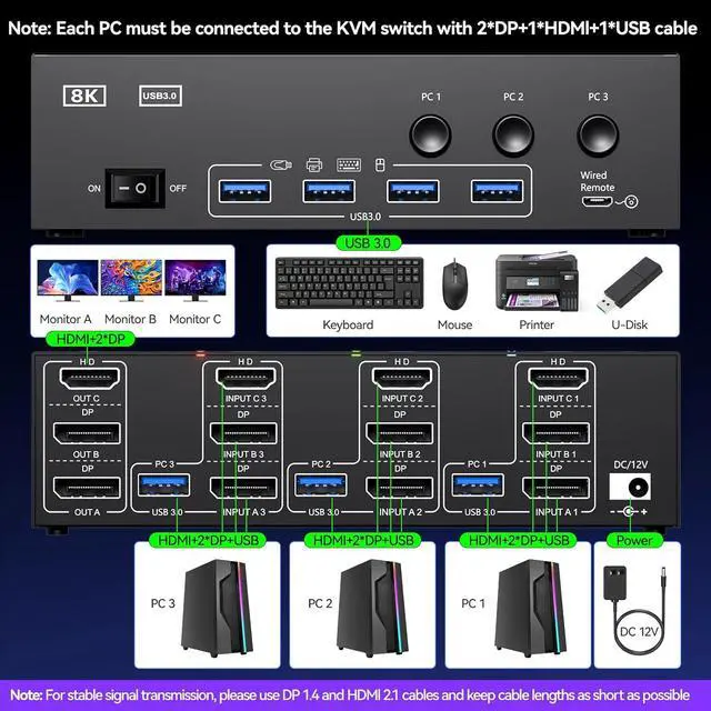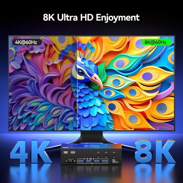 8K Ultra HD Triple Monitor KVM Switch HDMI 2.1 & DP 1.4 enabled 3 monitor KVM switches supports up to 8K@60Hz, 4K@144Hz & lower resolutions, delivering crystal-clear visuals with sharp, detailed imagery.