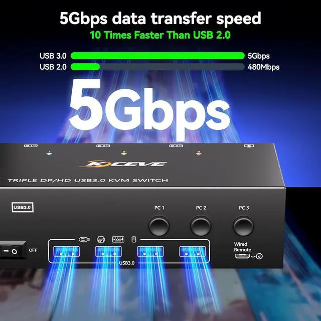 3 Monitor KVM Switch with 4 USB 3.0 Ports KVM Switch 3 computers 3 monitors integrated 4 USB 3.0 ports for keyboard, mouse, printer & USB drives Supports 5Gbps ultra-high-speed data transfer (10x faster than USB 2.0).