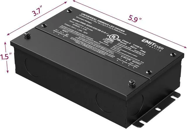 • SPECIFICATIONS: cUL us Listed, Class 2, Class P, Type HL, FCC compliant, damp location rated. Free air convection cooling within low profile compact aluminum housing (only 1.5-inch tall). Mounting foot at both ends allows for screw down upon flat surface for