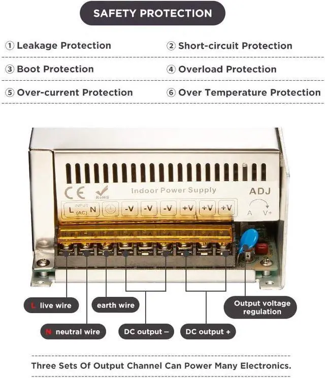 Multiple protection functions,Can resume normal operation after troubleshooting.Ensures the Safety of Using This Power Supply.
