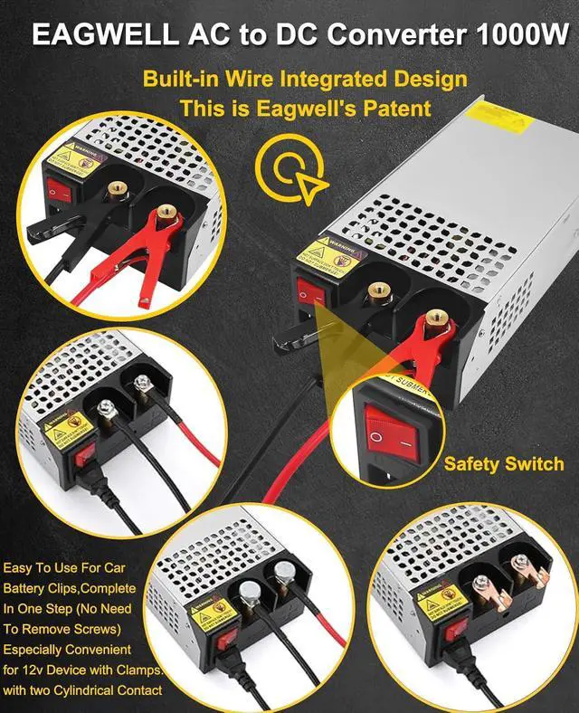 Plug-and-Play Setup with All-Inclusive Kit .Eagwell ac to dc converter includes UL-listed power cord, 12v power supply 1000w, wire lugs, metal clips, and screwseverything you need for clamp-style device connections. Dual wiring options (direct wire + terminal clamps) fit DIY projects, RVs, or industrial setups. No extra tools required