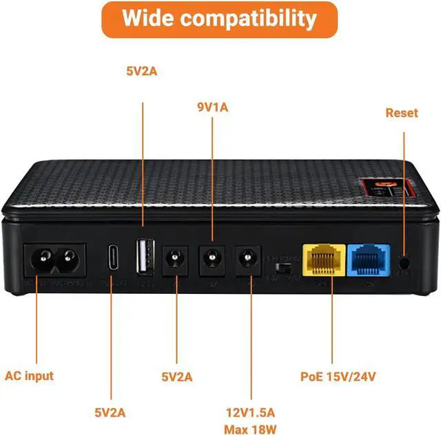 5V2A, 9V1A, 12V1.5A DC outputs and PoE ports power security cameras, while USB-A and USB-C ports charge phones