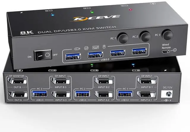 KVM Switch 2 Monitors Ultra HD 8K@60HzDual monitor KVM Switch displayport support resolution 8K@60Hz 4K@144Hz and downwards.this 2 monitors KVM aslo support input terminal to connect 3 computers with different resolutions, e.g. one is 4K@60Hz, the other is 4K@30Hz,