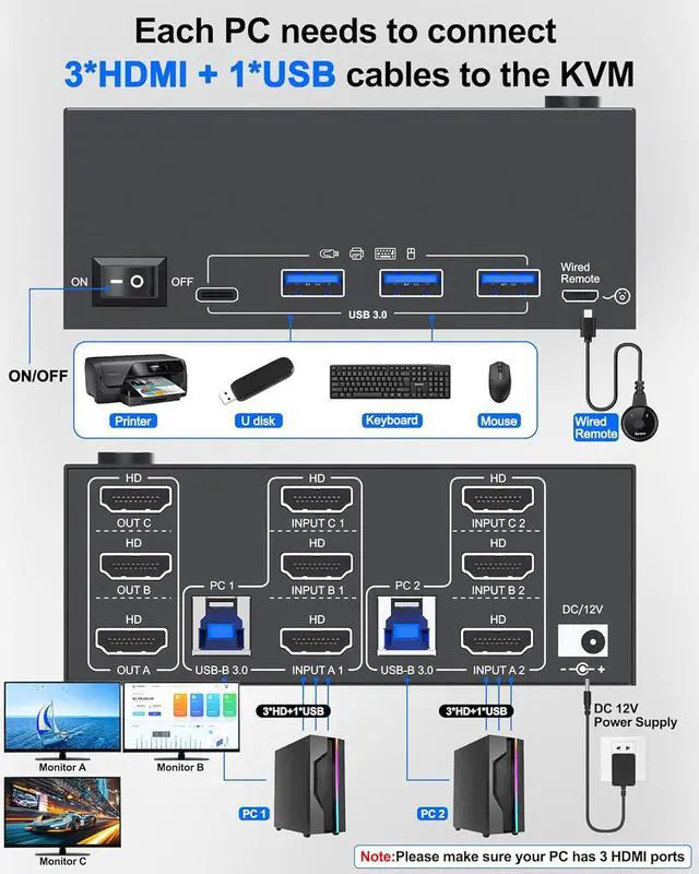 USB 3.0 HDMI 2.1 KVM Switch 3 Monitors 2 Computers 8K@60HzKCEVE Triple monitor KVM switch HDMI allows you to control 2 computers and 3 monitors with just one set of mouse and keyboard. Press "Windows+P" to select mirror mode or extended screen mode. Each PC requires 3 HDMI 8K cables + 1 USB cable plugged into the 3 monitor 2 computer KVM switch. Use KVM 3 monitors 2 computers to freely control 2 computers in the office or at home, saving space and keeping your desktop tidy.