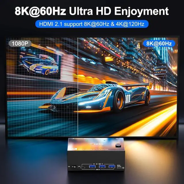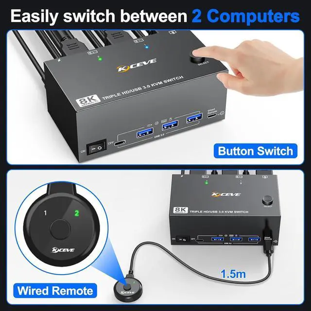 Plug and PlayTriple monitor KVM requires no additional driver software. KCEVE KVM switch HDMI USB 3.0 automatically adjusts to store the best resolution and refresh rate. KVM switch 4K@144Hz has an ON-OFF key. Make sure your computers, monitors, and cables support 8K. In order to make signal transmission more stable.