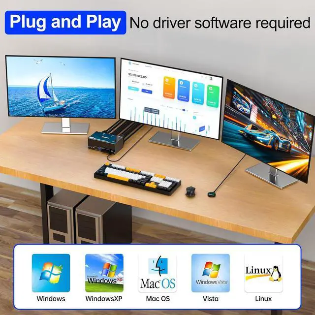 Wide CompatibilityKVM switch 3 monitors 8K@60Hz supports various HDMI input devices, such as desktop PC, laptop, tablet, TV box, Apple TV, PS5, projector, monitor, HDTV. KCEVE KVM switch 3 monitor HDMI is compatible with Windows11/ 10/8/7/XP/Vista, Mac OS, Linux and Chrome systems. HDMI KVM Switch 3 Monitors 2 computers are widely used in offices, conference rooms, multimedia teaching, home theaters, scientific research and testing, etc.