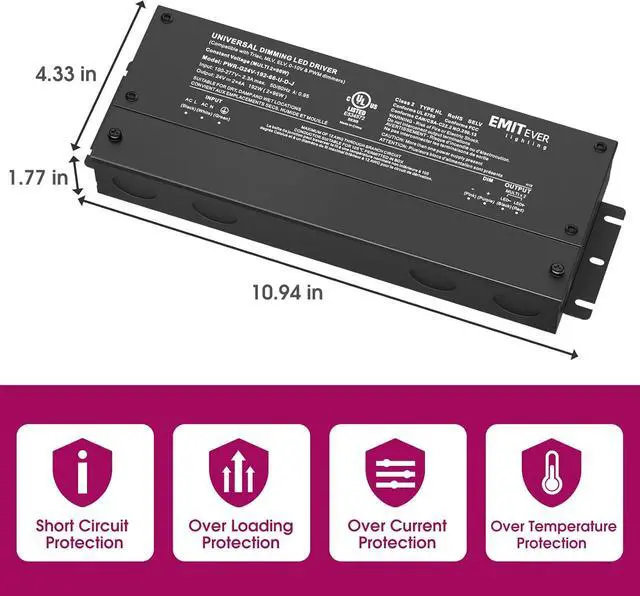 SPECIFICATIONS: cUL us Listed, Class II, Class P, Type HL, FCC compliant, damp location rated. Free air convection cooling within low profile compact aluminum housing (only 1.5-inch tall). Mounting foot at both ends allows for screw down upon flat surface for complete installation.