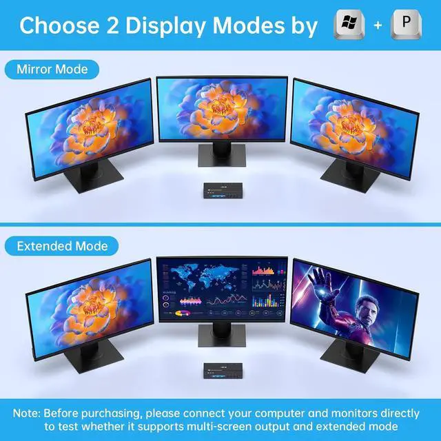 Plug-and-Play, Flexible Display ModesNo drivers required, easy to use. 8K KVM Switch Triple Monitor offers both Extended and Mirror modes. Extended mode expands your desktop across 3 monitors for productive multitasking experience; Mirror mode duplicates the display on all connected monitors, ideal for demonstrations. Note: macOS only supports Mirror Mode.