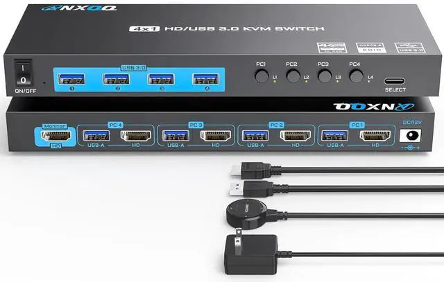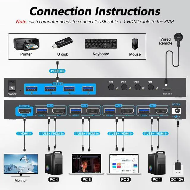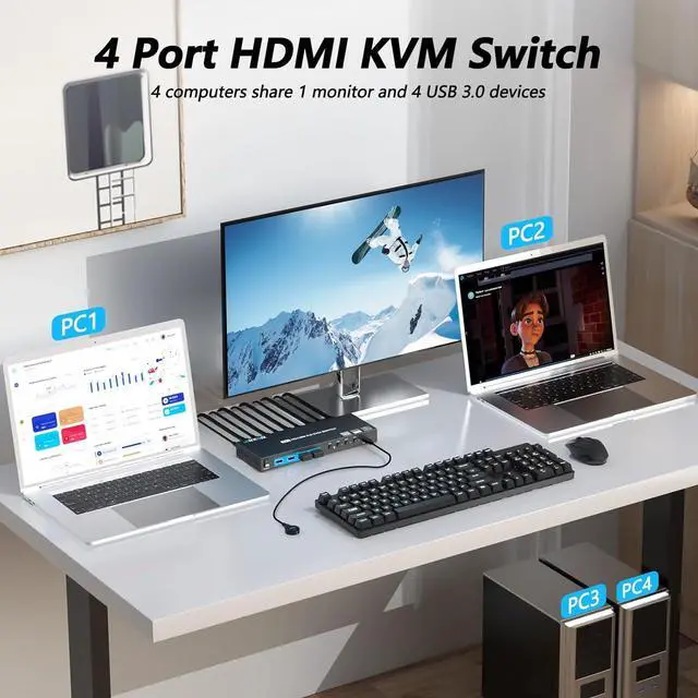 KVM Switch 4 ComputersThis KVM Switch HDMI allows users to control 4 computers to share 1 monitor and 4 USB 3.0 peripheral devices together. It's both a monitor switcher and a USB switcher in one. Say goodbye to preparing multiple devices or repeatedly plugging and unplugging them, life could be easier!